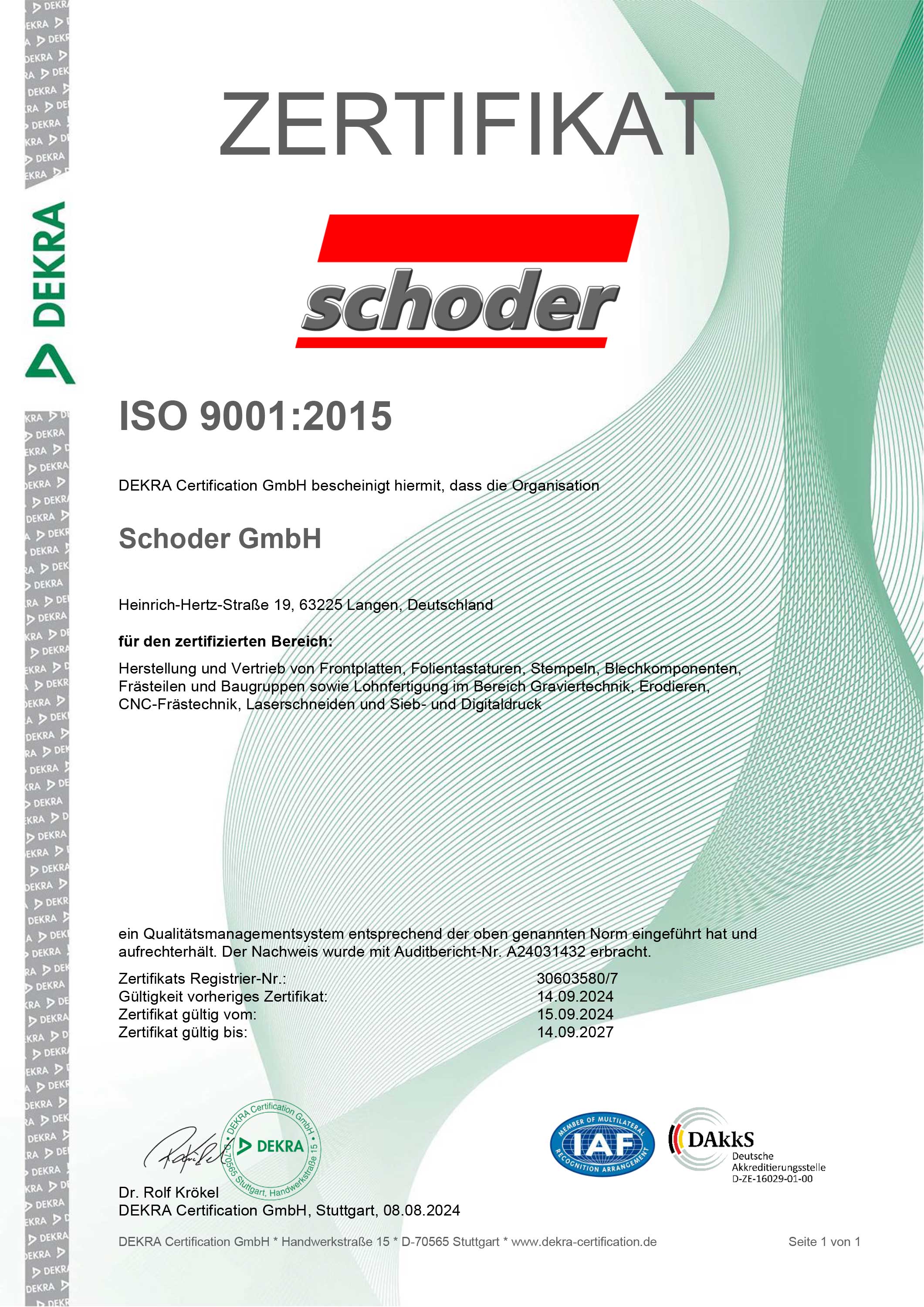 Nach eingehender Prüfung verleihen wir unserer Qualitätskontrolle die Bestnote! Seit 1997 sind wir nach DIN EN ISO 9001 zertifiziert. Die Qualitätsmanagement-Norm ISO 9001 ist national und international die meist verbreitete und bedeutendste Norm im Qualitätsmanagement (QM). Es werden Maßabweichungen bis in Hundertstelmillimeterbereiche erfasst. Unser prozessorientiertes Qualitätsmanagementsystem senkt die Fehlerquote und somit die Produktionskosten, was wir selbstverständlich an Sie weitergeben.